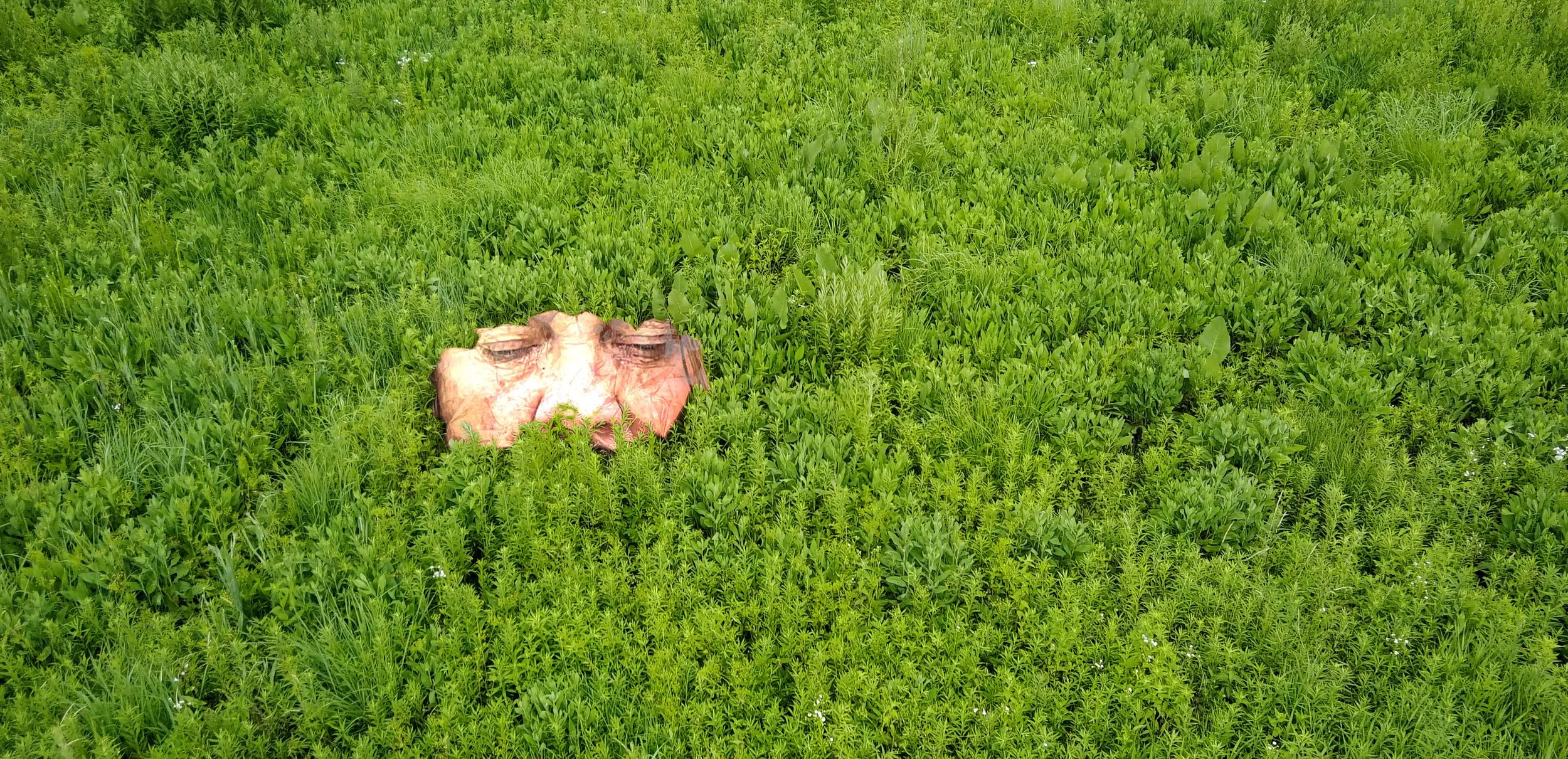 It is June 2024, and the Summer Solstice is approaching. I am in the driftless region of Wisconsin, at a very special parcel of land known as Pachamanka, just beginning to get settled amongst the plants, animals, and temporary family of other artists in retreat with me. Red arrives a day after the rest of us, baked in sun and vision. Nance Klehm, artist/ecologist, is the portal summoner here. Red will metabolize this experience as Prairie Portal, among the mesmerizing works now illuminating Area 405’s expansive warehouse gallery.