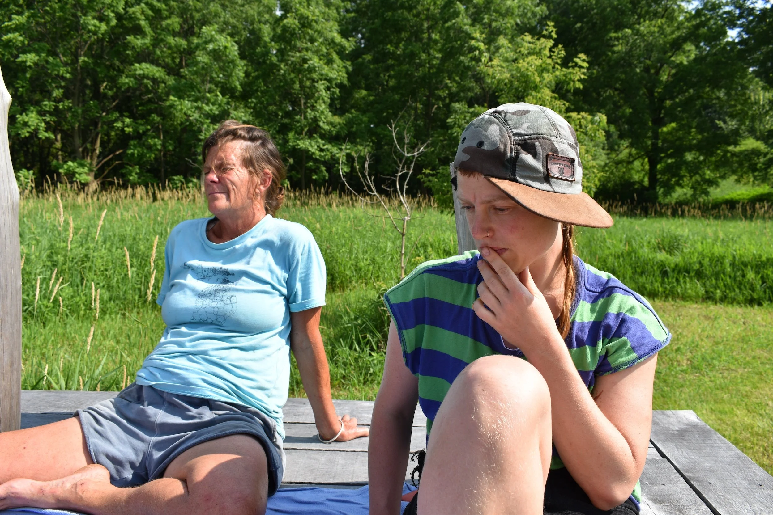 Red and I catch wind of a nearby swimming hole. We hop in their car and go check it out. An hour later we are waist deep in freshwater, standing at the cusp of a large bed of lily pads. I’m hesitant to cross their threshold, imagining the long spindles of roots and the mysterious creatures inhabiting them.
